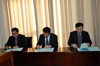 簽訂監(jiān)管承諾書(shū) 杜經(jīng)理與其他兩位公司代表上臺(tái)領(lǐng)取獎(jiǎng)牌