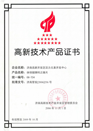 高新技術產(chǎn)品證書—鈣之緣