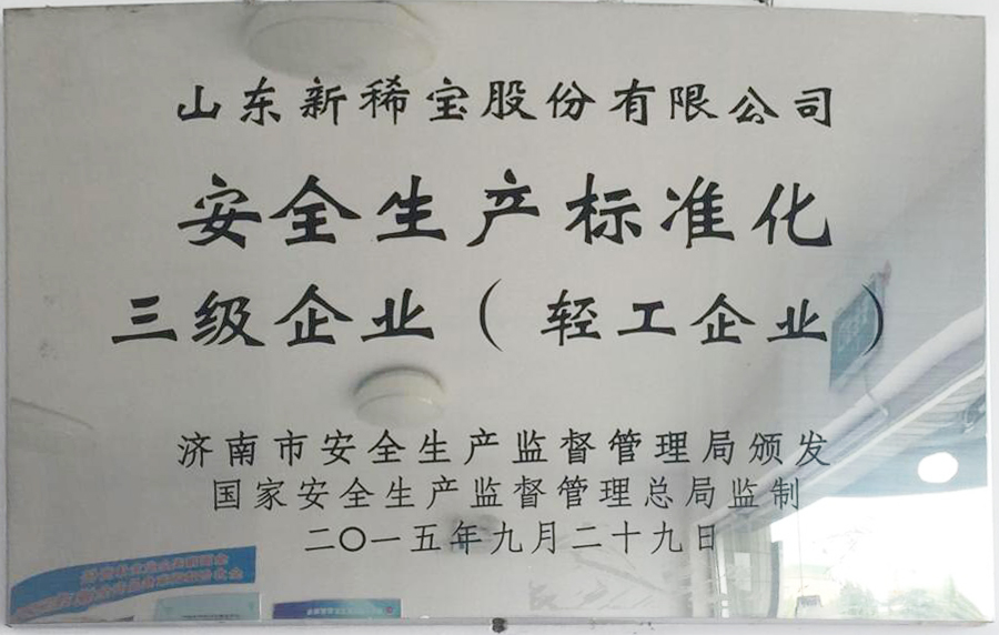2015年,被濟(jì)南市安全生產(chǎn)監(jiān)督管理局評(píng)定為“安全生產(chǎn)標(biāo)準(zhǔn)化三級(jí)企業(yè)”